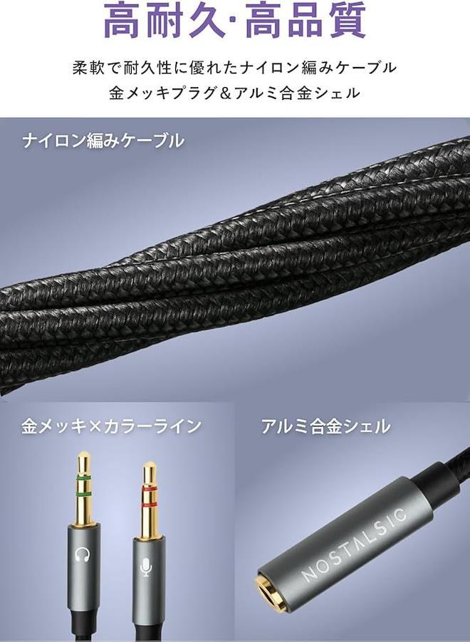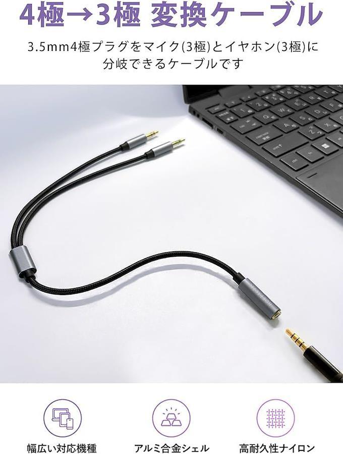 「3.5mm 4極 - 3極 変換ケーブル」3.5mm 4極(TRRS)プラグのヘッドセットやイヤホンを、マイク(3極)とオーディオ(3極)に分岐し、パソコンやオーディオ機器に接続できる変換ケーブルです。