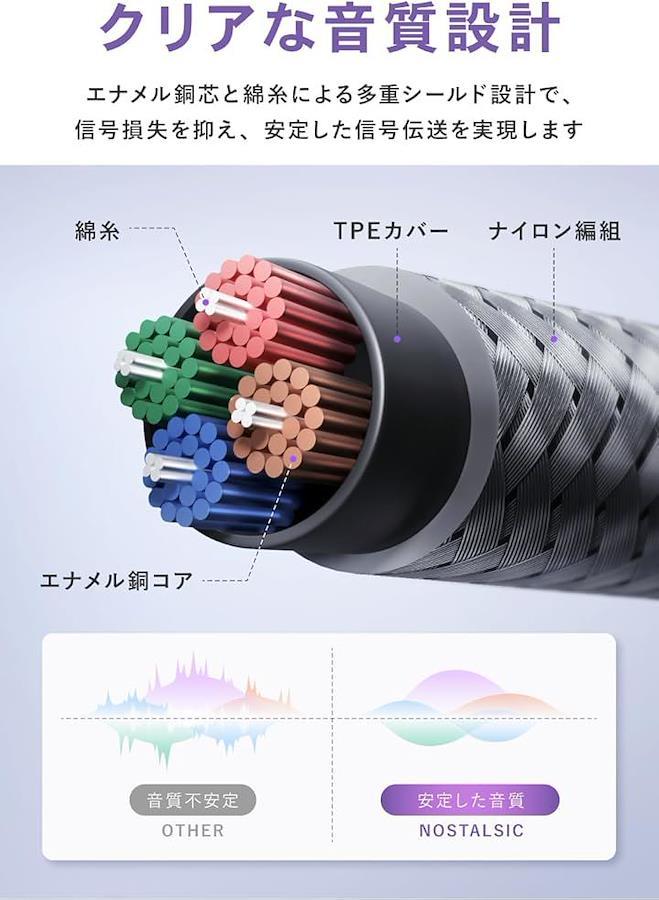 「高音質&安定した信号伝送」多重シールド構造と高純度エナメル銅線により、外部ノイズを抑えてクリアな音質を実現。