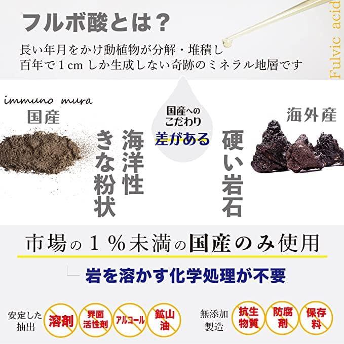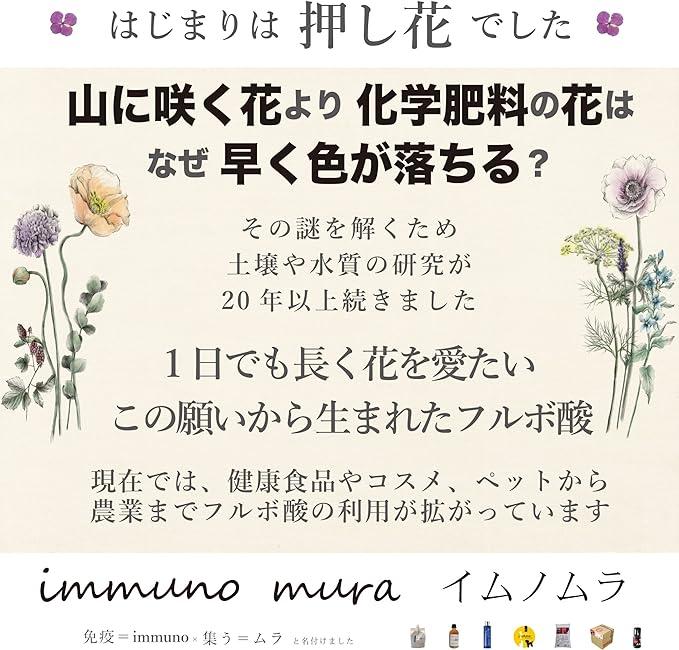 この商品について 注意事項:本体商品とともに、「60?カップ付きボトル」および「RitzStoreオリジナル取扱説明書」が同封されているか確認してください。【RITZSTORE】販売商品には全て完備していますが、その他の販売店の場合同封されていないケースがあります。同封されてないの場合、不備ですので、キャンセル可能です。イムノムラの【フルフミン201】は天然由来のミネラルとフルボ酸を高濃度抽出。動植物が長年かけて分解・発酵を繰り返して堆積した貴重な地層から取り出した海洋性由来のフルボ酸から生まれています。そして、32種以上の天然ミネラルも含んでいます。 海に囲まれた島国 日本。だから日本産のフルボ酸は、海洋性の藻の堆積物から生まれています。その土壌は、”きな粉” のようにサラサラで、水で抽出できます。化学的に岩石を溶かす化学処理が不要な国産のイムノムラ【フルフミン201】の製造には、溶剤・アルコール等使用せず、抗生物質、ホルモン剤、化学添加物などは一切未使用。九州阿蘇湧水をイオン化した水により抽出するなど、安心安全な自然の製法にこだわりに、真心込めてお届けしています。 イムノムラの【フルフミン201】は、量を管理できる計量カップ付き。お得な詰替え用パウチタイプは、1リットルと300 mlの他、300mlの瓶タイプもございます。 天然フルボ酸【フルフミン201】ご利用方法:①1日当たり3?10mlを目安に、毎日お飲みの飲料に希釈しご愛飲ください。ペットボトルやタンブラーにお好みの飲み物と一緒に入れて、毎日こまめに飲まれることをお勧めします。また、晩酌に数滴づつ垂らしたり、ヨーグルトやお酢など発酵食品に混ぜてご利用される方もいます。 注意事項:多量摂取されても、吸収されず排出されますので問題ございません。ミネラル成分が底に結晶化して沈殿しますが、品質に問題はございません。飲用時にはよく振ってご使用ください。ご利用後、体調がすぐれない場合には、お医者様とご相談ください。本商品には、植物エキス等は含まれておりません。