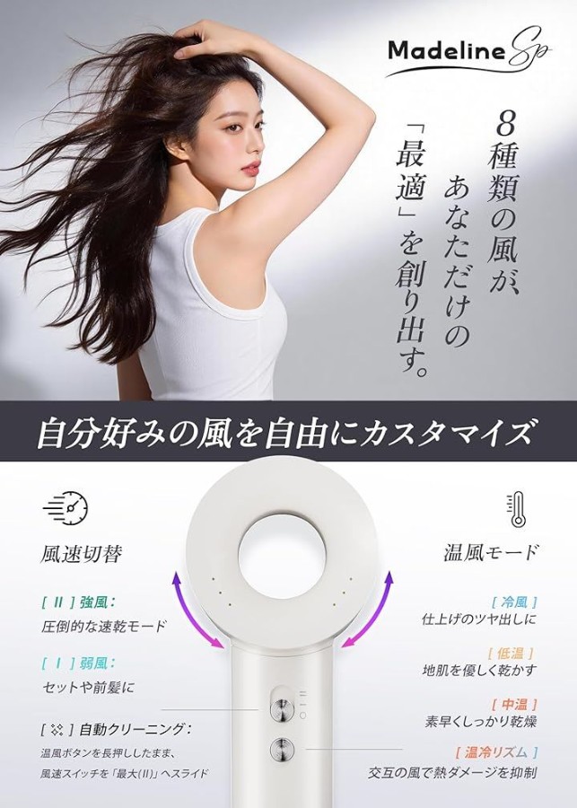 「忙しい朝でも、プロ仕様の速乾でツヤツヤの美しい髪へ」MADELINEspは、毎分約11万ストロークの高性能ブラシレスモーターを搭載し、風量(1.8m³/分)と高速風速(21m/秒)を実現。