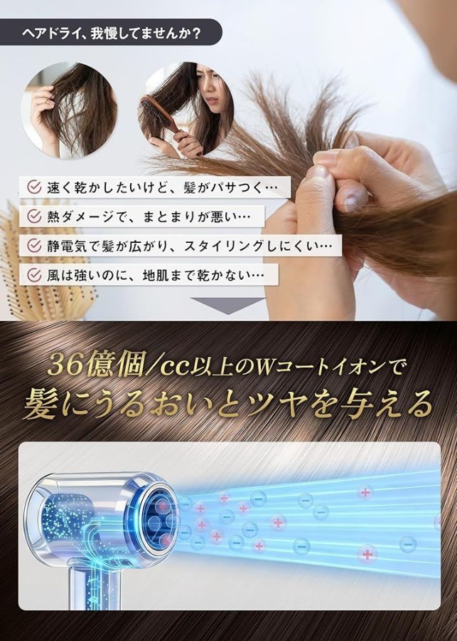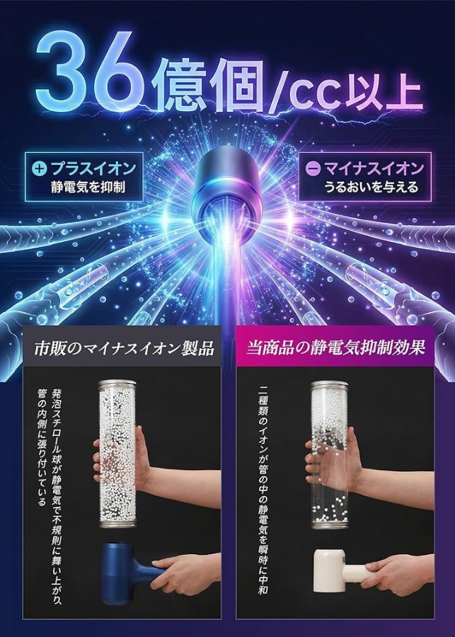 「36億個のプラズマイオンが髪をやさしくケア、温冷交互モード搭載」36億個の超高濃度プラズマイオンが髪の静電気を効果的に抑制し、ツヤと潤いを与えます。