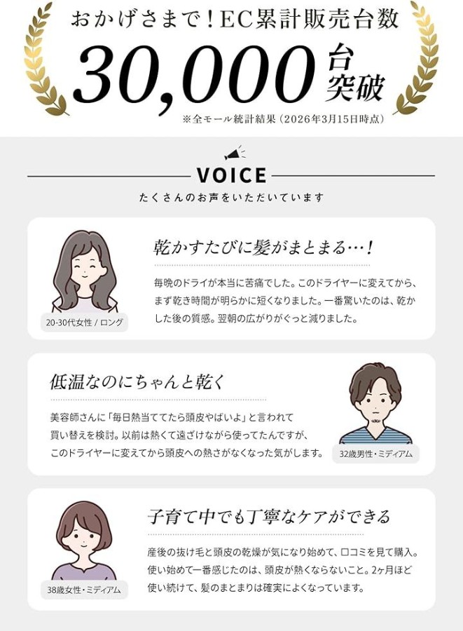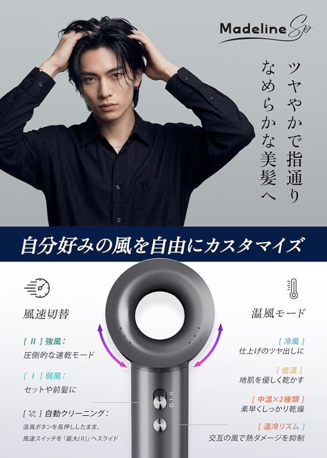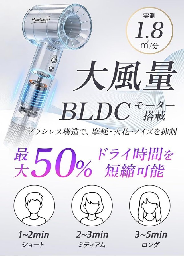 「忙しい朝でも、プロ仕様の速乾でツヤツヤの美しい髪へ」MADELINEspは、毎分約11万ストロークの高性能ブラシレスモーターを搭載し、風量(1.8m³/分)と高速風速(21m/秒)を実現。
