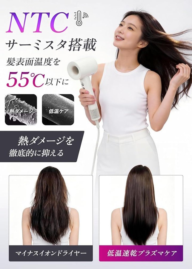 「36億個のプラズマイオンが髪をやさしくケア、温冷交互モード搭載」36億個の超高濃度プラズマイオンが髪の静電気を効果的に抑制し、ツヤと潤いを与えます。
