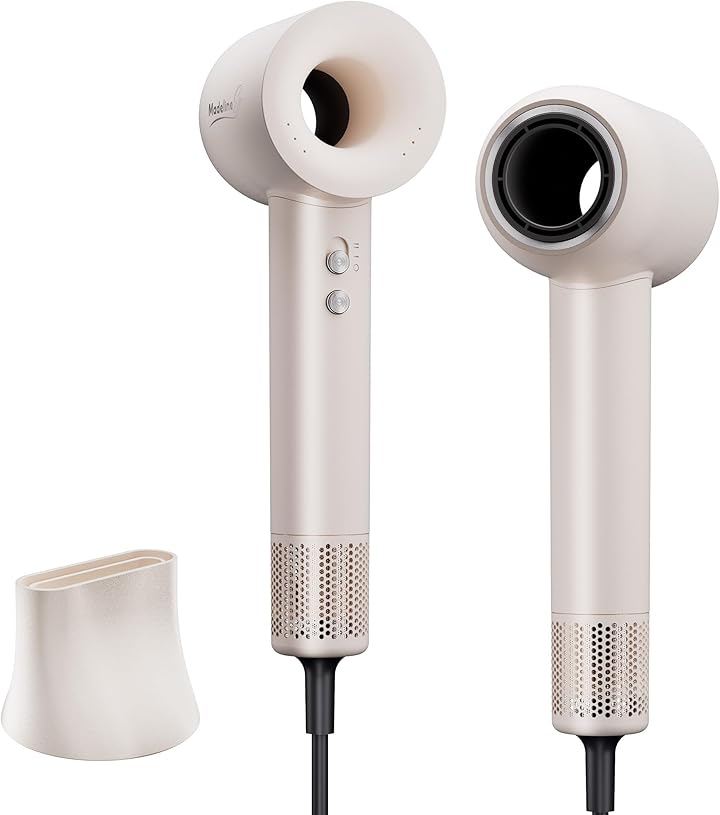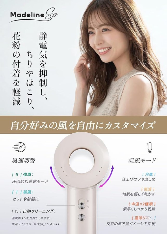 「忙しい朝でも、プロ仕様の速乾でツヤツヤの美しい髪へ」MADELINEspは、毎分約11万ストロークの高性能ブラシレスモーターを搭載し、風量(1.8m³/分)と高速風速(21m/秒)を実現。