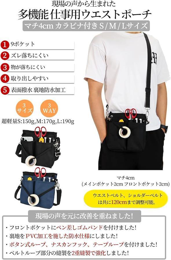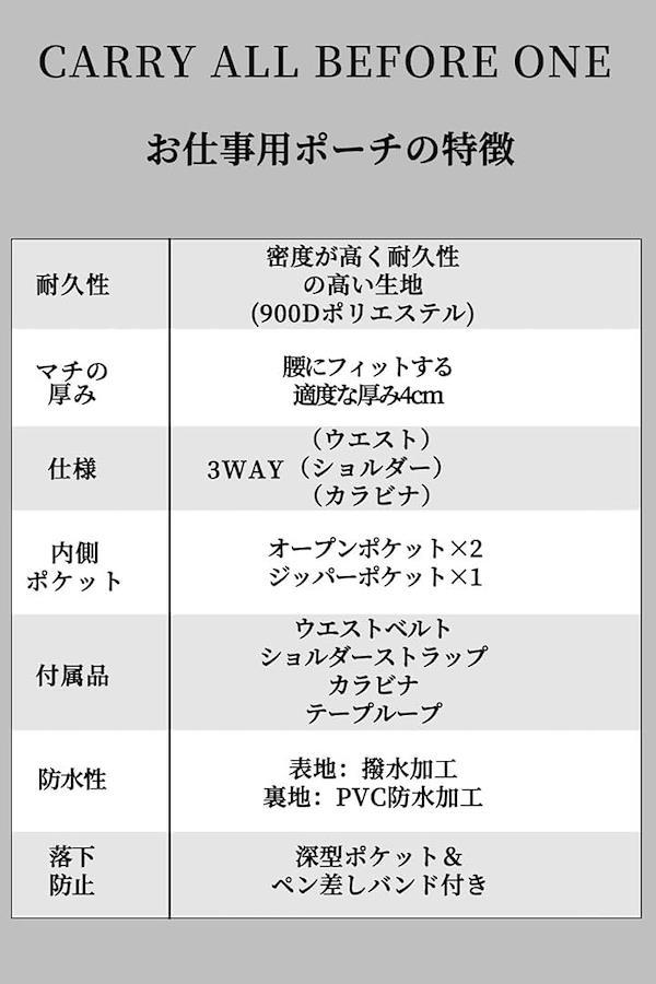 *現場の声を汲んで生まれた多機能お仕事ポーチ*普段から動き回る現場の意見を取り入れ何度も試行錯誤を重ねて作りました。*「3WAY多機能ウエストポーチ 9ポケット マチ付き」Dカン、カラビナ、ショルダーベルト、ウエストベルト、テープループ、ペン差しゴムバンドなどの便利な機能を盛り込んだお仕事ポーチ。