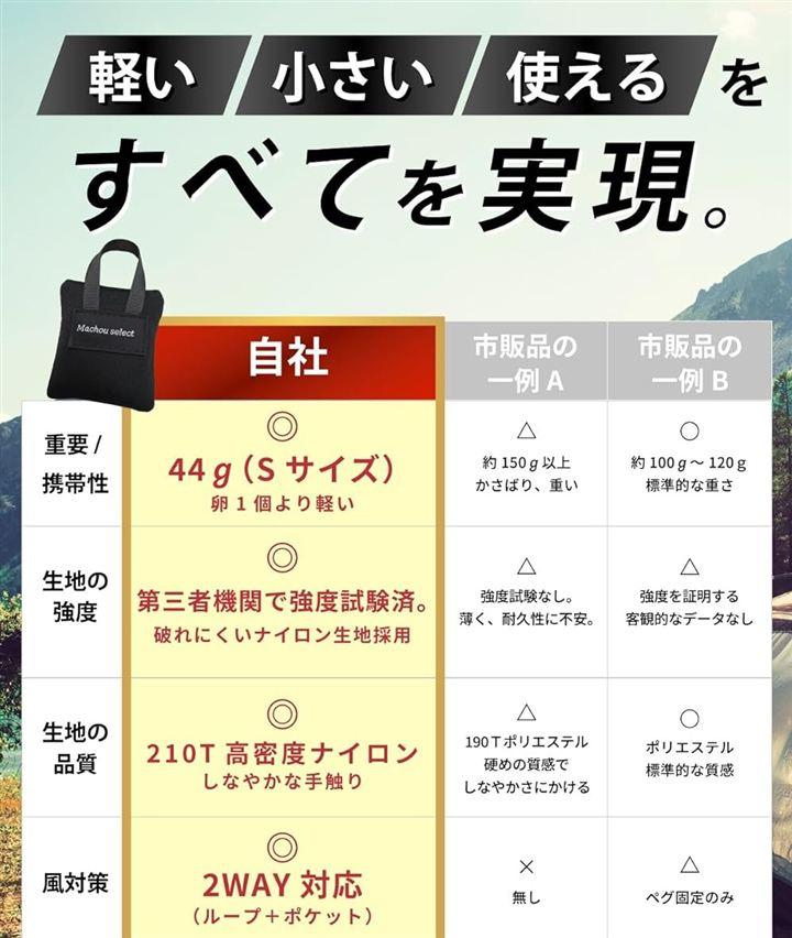 「超軽量コンパクト」Sサイズ(70x110cm)は44g、Mサイズ(110x140cm)は75g。