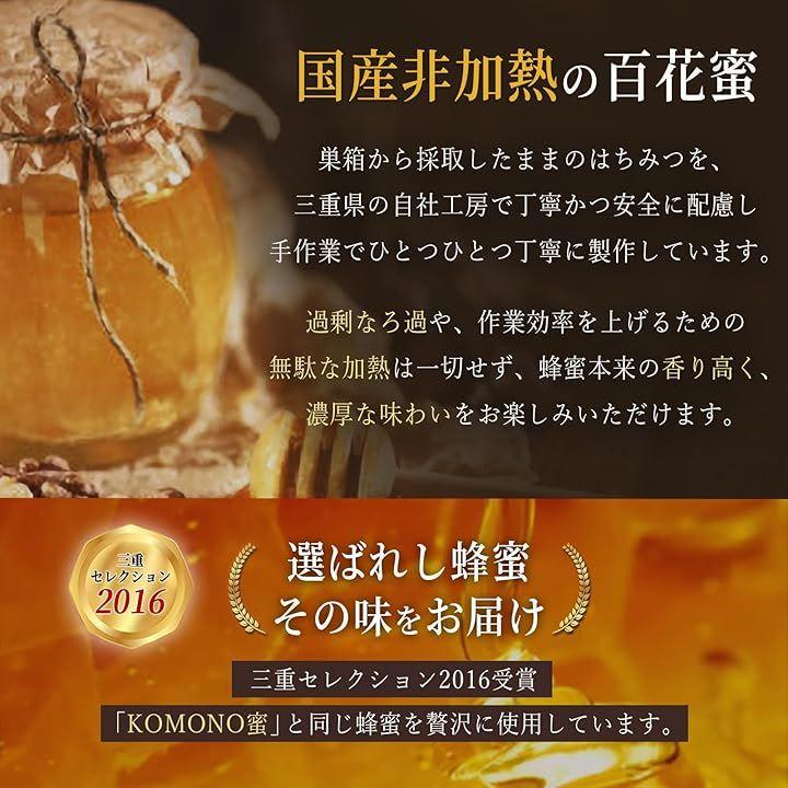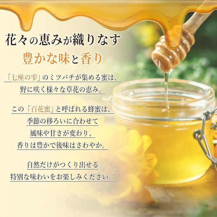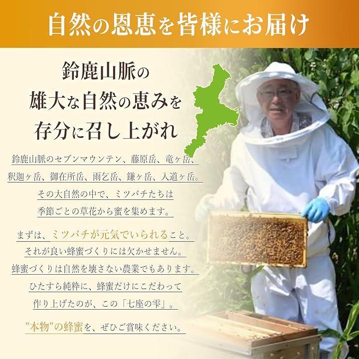 「三重セレクション2016」受賞のKOMONO蜜と同じ巣箱から採れたはちみつである「七座の雫(ななくらのしずく)」は、食べた瞬間、百花蜜の贅沢な味と香りが口に広がります。一切の添加物を加えず、また無駄な熱処理もしない貴重で濃厚で贅沢なはちみつ。
