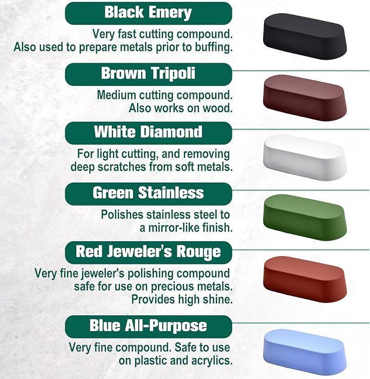 「多色・多用途」黒、茶、白、緑、赤褐色、青、粗磨きから細磨きの順に使用し、磨いた対象物は鏡面または高光沢の効果が得られます。
