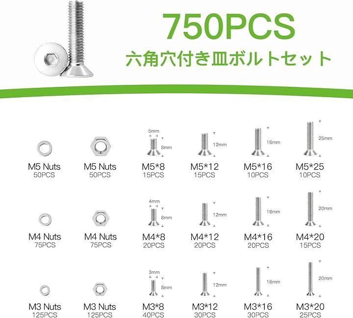 750本入 ねじ セット M3 M4 M5 皿ねじ SUS304 ステンレス 六角穴付き 皿ビス さら小ねじ ネジ 精密機器用なべ小ねじ ナット ワッシャー 収納ボックス付き