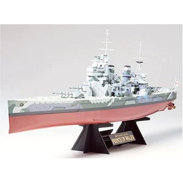 タミヤ 1/350 艦船シリーズ No.11 イギリス海軍 戦艦 プリンス・オブ・ウェールズ プラモデル 78011 1941年12月のマレー沖海戦時の姿をモデル化。姉妹艦キングジョージ5世との違いなども正確に再現しました。特に60点のパーツで精密に再現された艦橋部分は一番の見どころ。6基48挺のポンポン砲など主要部を固める対空兵装も見逃せません。艦載機のウォーラス飛行艇やマレー沖で対戦した日本海軍96式陸上攻撃機と一式陸上攻撃機も各1機セット、大きさを比べるのも興味深いでしょう。展示台と艦名プレート付き。魅力あふれる大型艦船モデルの製作をお楽しみください。七つの海で活躍した各国の有名艦を1/350スケールでモデル化したシリーズです。駆逐艦は30cm、戦艦は70cm前後、そしてアメリカ原子力空母エンタープライズは約1mものビッグサイズ。全体のプロポーションを的確にとらえて実感たっぷりに再現したのはもちろん、細部のモデル化も精密そのものです。