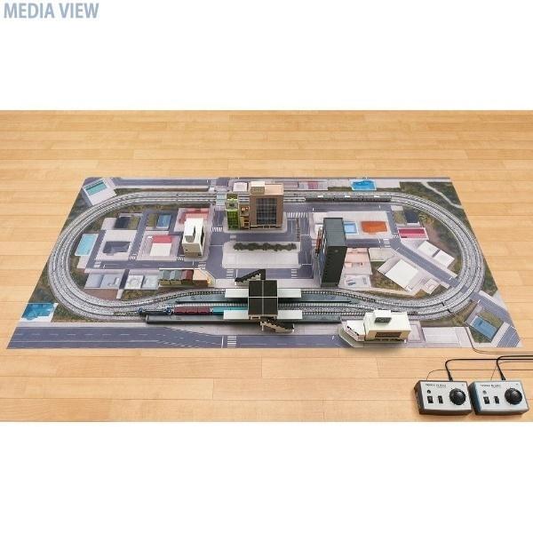 簡単にジオラマの情景を楽しめるマットです。線路配置はA+B+Dパターンの組み合わせとなります。別売りのホーム・駅舎を中心にストラクチャーを置くと臨場感がさらに高まります。製品サイズ (1800×900)mm。お楽しみいただいた後は丸めて収納可能です。車両・レール・ストラクチャー・制御機器は別売です。