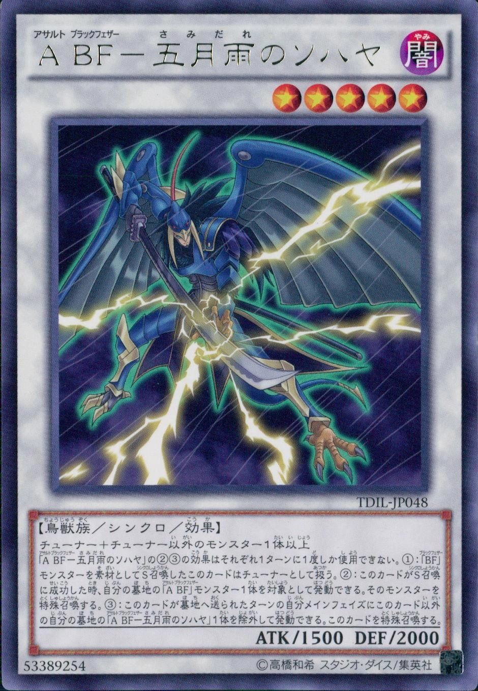 ■発売年月日2016/04/09搭載パック[TDIL]THE DARK ILLUSION収録基本パックレアリティレア種類シンクロモンスター属性闇種族鳥獣族星(レベル、ランク)5攻撃力1500守備力2000リンク‐リンク方向‐ペンデュラムレフト‐ペンデュラムライト‐シリーズ第9期効果テキストチューナー+チューナー以外のモンスター1体以上 「A BF-五月雨のソハヤ」の②③の効果はそれぞれ1ターンに1度しか使用できない。①:「BF」モンスターを素材としてS召喚したこのカードはチューナーとして扱う。②:このカードがS召喚に成功した時、自分の墓地の「A BF」モンスター1体を対象として発動できる。そのモンスターを特殊召喚する。③:このカードが墓地へ送られたターンの自分メインフェイズにこのカード以外の自分の墓地の「A BF-五月雨のソハヤ」1体を除外して発動できる。このカードを特殊召喚する。ペンデュラムテキスト-■商品ランクについてA:中古品で比較きれいな商品です。コレクター向きではございません。B:カジュアルプレイ向きです。削れやめくれ、傷などがある場合がほとんどです。