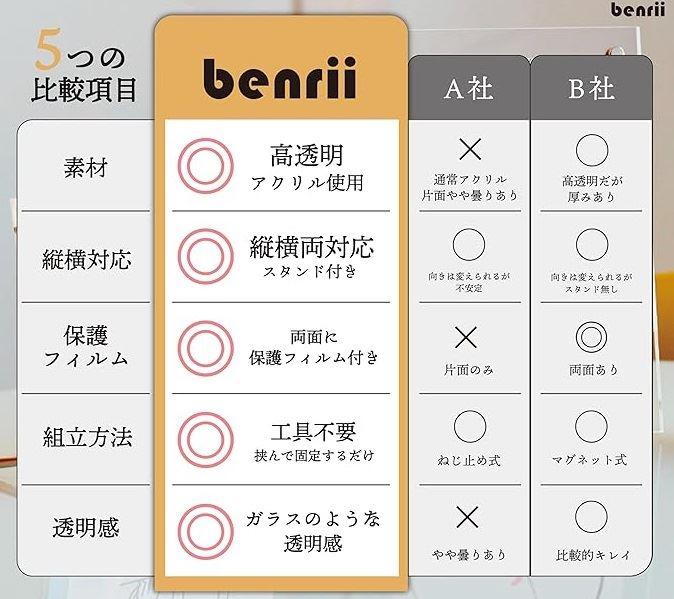 「耐久性」benriiのフォトフレームはアクリル製なので、ガラス製に比べて壊れにくく、割れたガラスで怪我をすることもありません。