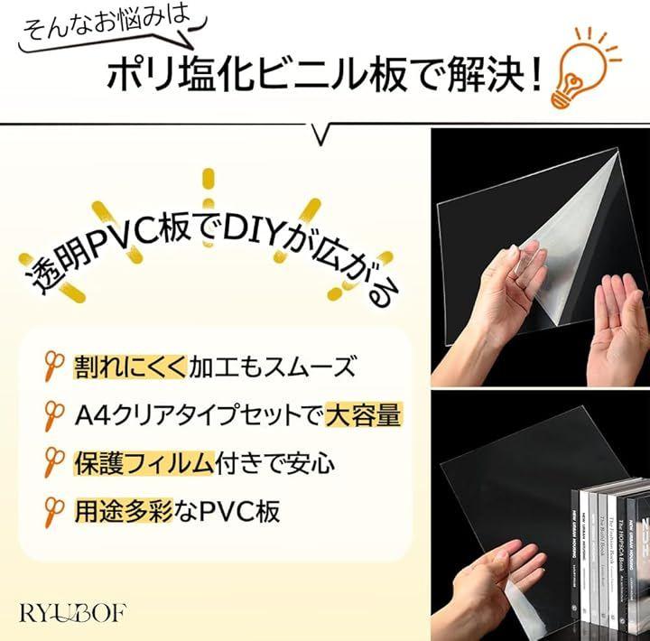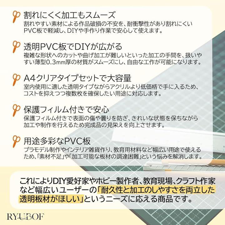「透明PVC板でDIYが広がる」ポリ塩化ビニル板(塩ビ板)は、A4サイズで扱いやすく、0.3mmの薄さなのでプラモデルやインテリア雑貨制作などあらゆるDIYシーンで幅広く活用できます。
