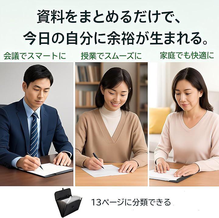A4サイズ対応の13ポケット設計で、案件別・月別にしっかり分類できるから、必要な資料を探す時間をゼロに。