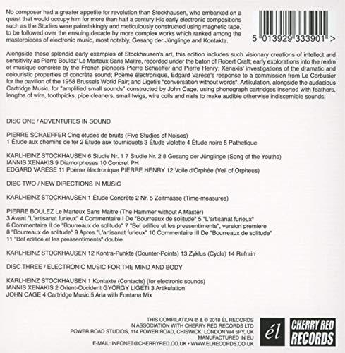 UK three CD set. Something truly radical happened to the European classical music tradition in the years after the Second World War. At a time when the revolutionary principle of 12-tone composition instigated by Schoenberg was beginning to be regarded among young composers as pass?, some had witnessed the horrors of war and for them in particular, the need to make a definitive break with the past and the conventions and conflicts which sprang from it was paramount. No composer had a greater appetite for revolution than Karlheinz Stockhausen, who was embarking on a quest that would occupy him for more than half a century, and which would take in a whole gamut of constantly re-defined objectives - among them "point music", "spatial music" and "multi-formula composition". His early electronic compositions such as the Studies were painstakingly and meticulously constructed using magnetic tape, to be followed over the ensuing decade by the works which ranked among the masterpieces of electronic music, Gesang der J?nglinge (Song of the Youths) and Kontakte (Contacts). All of these unprecedented early electronic works are included in this box set presentation which also incorporates such visionary creations of intellect and sensitivity as Pierre Boulez' orientally flavored 'Le Marteux Sans Maitre', recorded under the baton of Robert Craft, Xenakis' brilliant explorations of the dramatic and colouristic properties of concr?te sound, 'Po?me ?lectronique', Edgard Var?se's extraordinary response to a commission from Le Corbusier for music for the pavilion of the 1958 Brussels World Fair, and Ligeti's "conversation without words", 'Artikulation', alongside the audacious Cartridge Music, for "amplified small sounds" constructed by John Cage, using phonograph cartridges inserted with feathers, lengths of wire, toothpicks, pipe cleaners, small twigs, wire coils and nails to make audible otherwise indiscernible sounds. The pioneering work of these composers proved an inspiration for future generations of artists looking to free themselves from the dead weight of convention.
