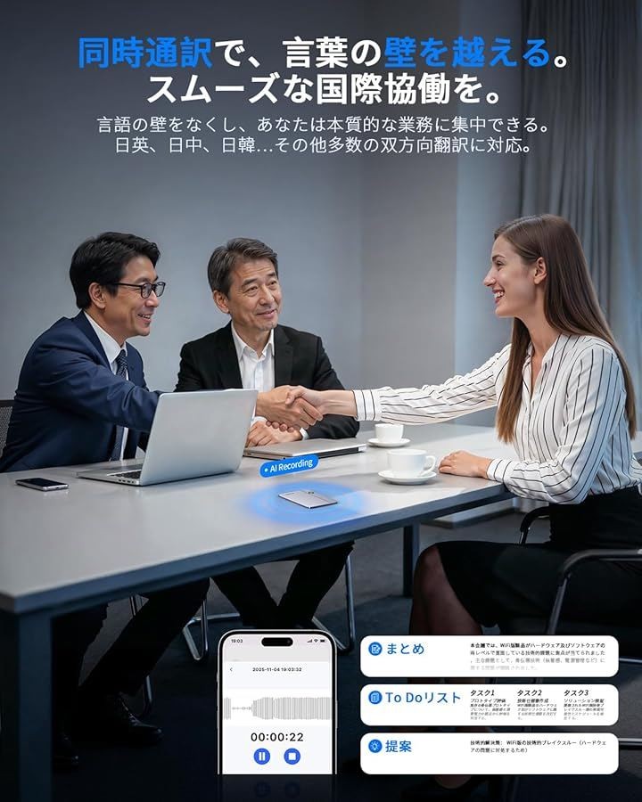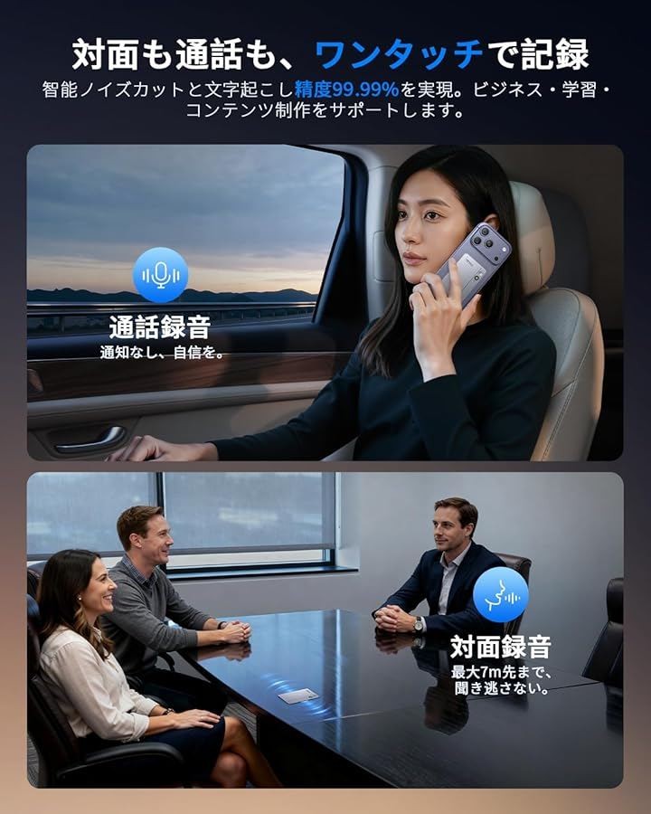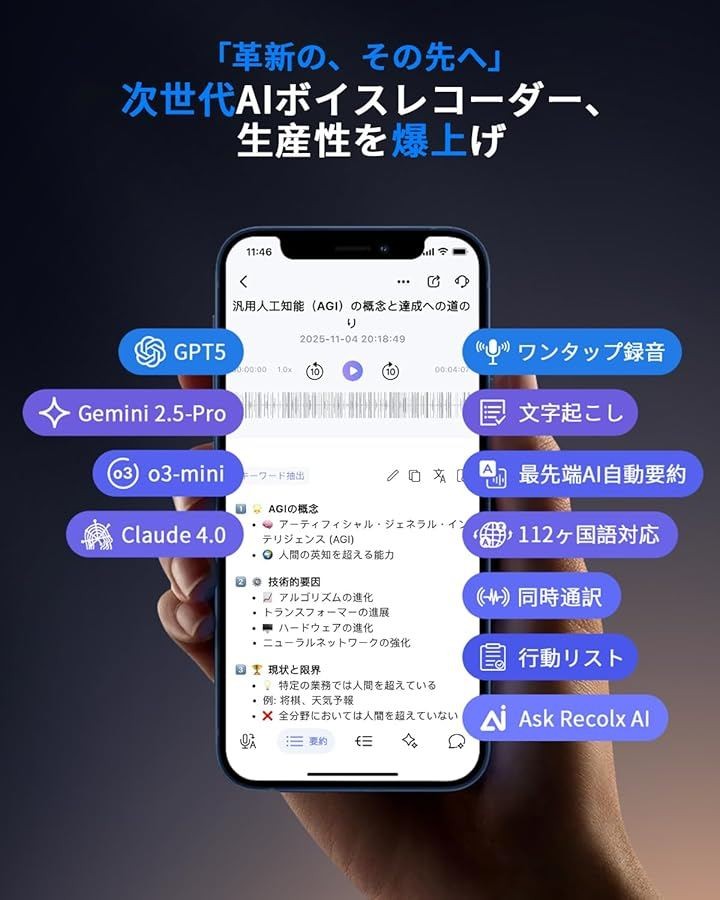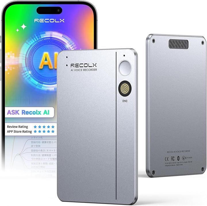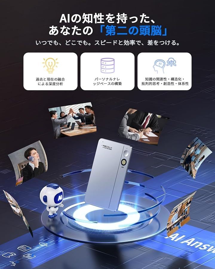AIボイスレコーダーRecolx AI議事録 超高精度文字起こし/最先端AI自動要約/同時通訳/行動リスト/AIに質問/話者識別機能/専門用語 通話/対面録音 AI指向性収音レコーダー 最大7m音声収音 112ヶ国語対応 マルチモーダル入力 iPhone&Android対応