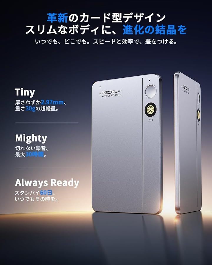「革新の、その先へ。次世代AIボイスレコーダーが、生産性を爆上げ」会議・打ち合わせ・講義…情報の記録、整理に時間を奪われていませんか?Recolx AIレコーダーカードが、その課題を解決します。