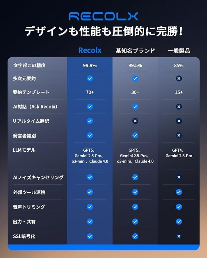 Recolxが実現した新次元のAI録音技術は、雑音を徹底排除し、99.99%の驚異的精度でクリアな音声を再現することを約束します。