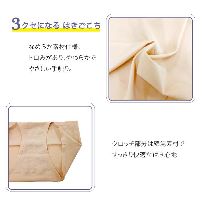 【 商品詳細】<おすすめポイント>シームレス加工で肌あたりがなめらか薄着でもアウターにひびきにくいヒップ全体を包み込み自然な丸み高い伸縮性で動きにフィット、するりと気持ちいい素材感でノンストレス縫い目によるチクチク痒みを軽減【サイズ展開】・M( ヒップ:87~95cm)・L( ヒップ:92~100cm )・LL( ヒップ:97~105cm )・3L( ヒップ:102~110cm )ゆったり着用したい方は、1つ上のサイズがオススメです。【商品特徴】・シームレス・縫い目が少ない・ヒップ全体を包み込むスタンダードタイプ・なめらか素材【素材】ナイロン85%・ポリウレタン15% クロッチ部分:ポリエステル65%・綿35%【お洗濯について】洗濯ネットに入れてお洗濯してください。・タンブル乾燥はお避け下さい。・濡れた状態で擦れると、他のものへ色移りする恐れがあります。・白や淡色のものと一緒に洗わないでください。・長時間濡れたままで放置しないでください。【使用上の注意】・傷・腫れ物・湿疹などお肌に異常がある時は使用しないでください。・使用中、使用後に気分が悪くなったり体に異常が現れた場合は直ちにご使用をおやめ下さい。・きつく感じた際は無理をせず適度に着脱を繰り返してください。・本品は強く引っ張ると破ける恐れがありますのでご注意ください。