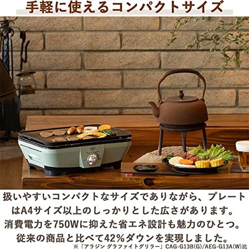 【手軽に使えるコンパクトサイズ】扱いやすいコンパクトなサイズでありながら、プレートはA4サイズ以上の広さがあります。また、消費電力を750Wに抑えた省エネ設計も魅力のひとつ。従来の商品と比べて42%ダウンを実現しました。※「アラジン グラファイトグリラー」CAG-G13B(G)/AEG-G13A(W)比