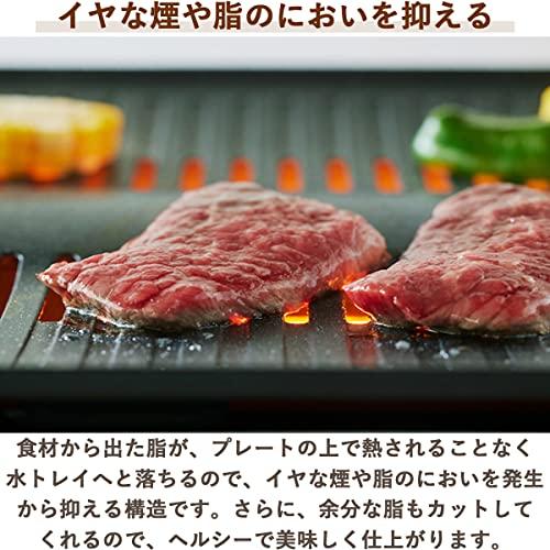 【イヤな煙や脂のにおいを抑える】食材から出た脂が、プレートの上で熱されることなく水トレイへと落ちるので、イヤなにおいや煙が発生しにくい仕組みです。さらに、「弱火/減煙/強火」の3つの火力切り替え付き。「減煙モード」は煙が気になる時におすすめです。