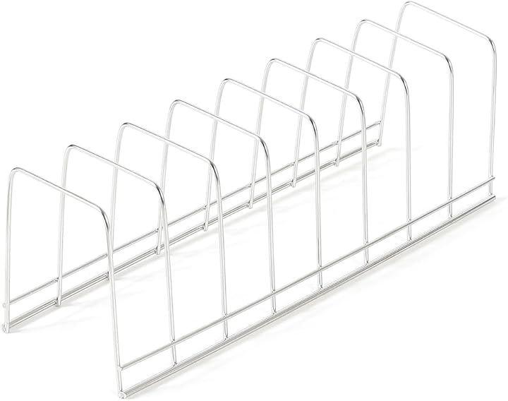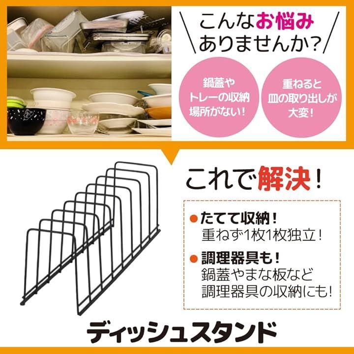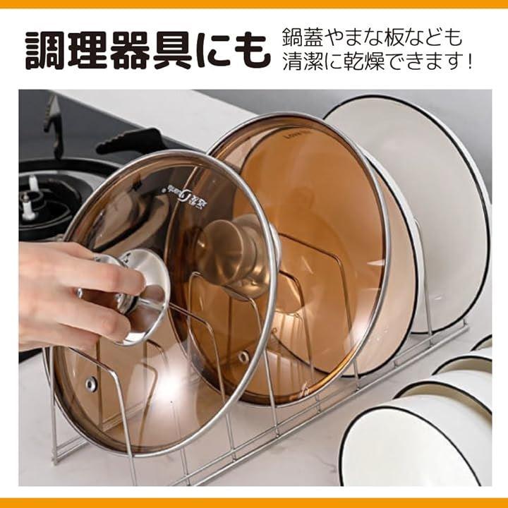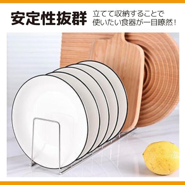 「シンプルな見た目で驚きの収納力」9本の仕切りワイヤーが付いているので蓋だけではなく大皿やまな板も立て掛けられます。