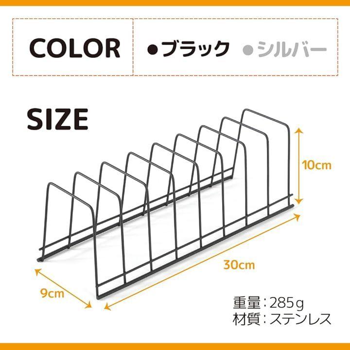 「商品詳細」サイズ(約):幅30cm、奥行9cm、高さ10cm、間隔幅3.5cm 重量:285g 材質:ステンレス、カラー:シルバー / ブラック