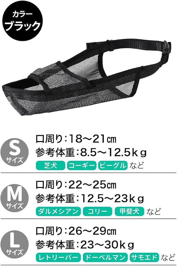 「商品詳細」本体:1個 サイズ:Sサイズ(口周り18~21cm)、参考体重:8.5~12.5kg、Mサイズ(口周り22~25cm)、参考体重:12.5~23kg、カラー:ブラック