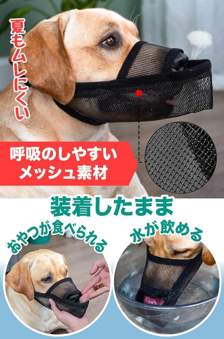 「呼吸しやすい設計」通気性に優れたメッシュ生地を採用しているので息苦しさを感じることがなく、口輪を外さずにそのまま水を飲めます。