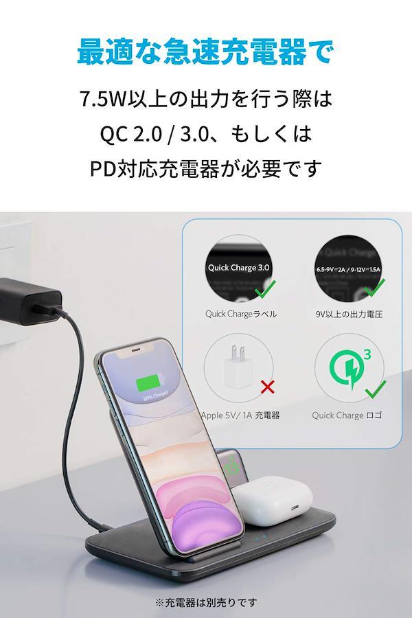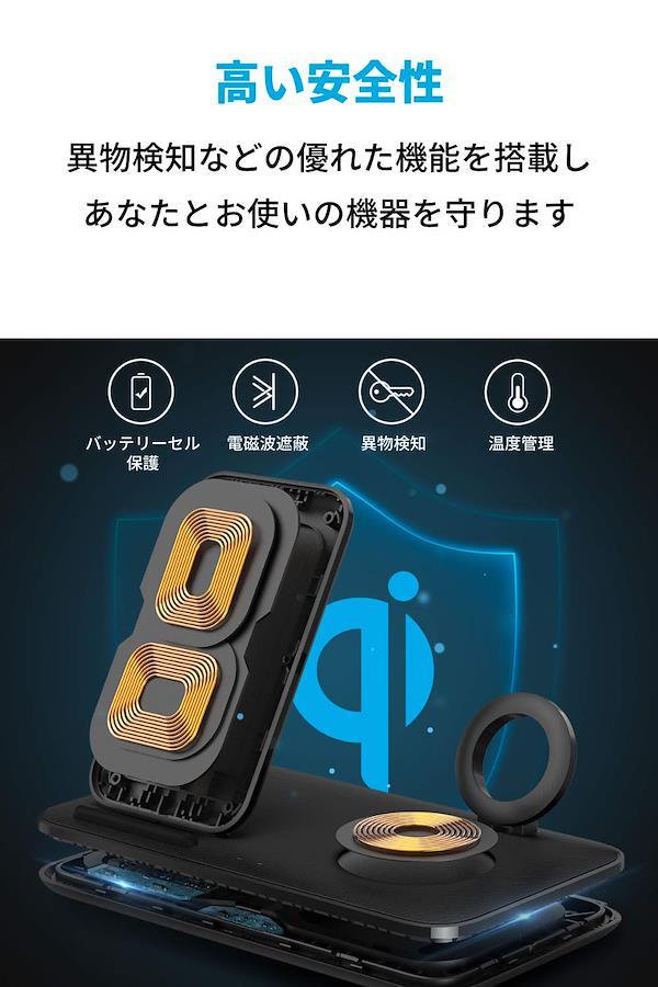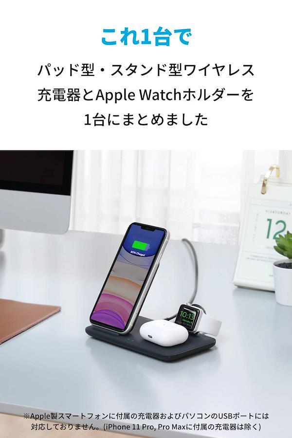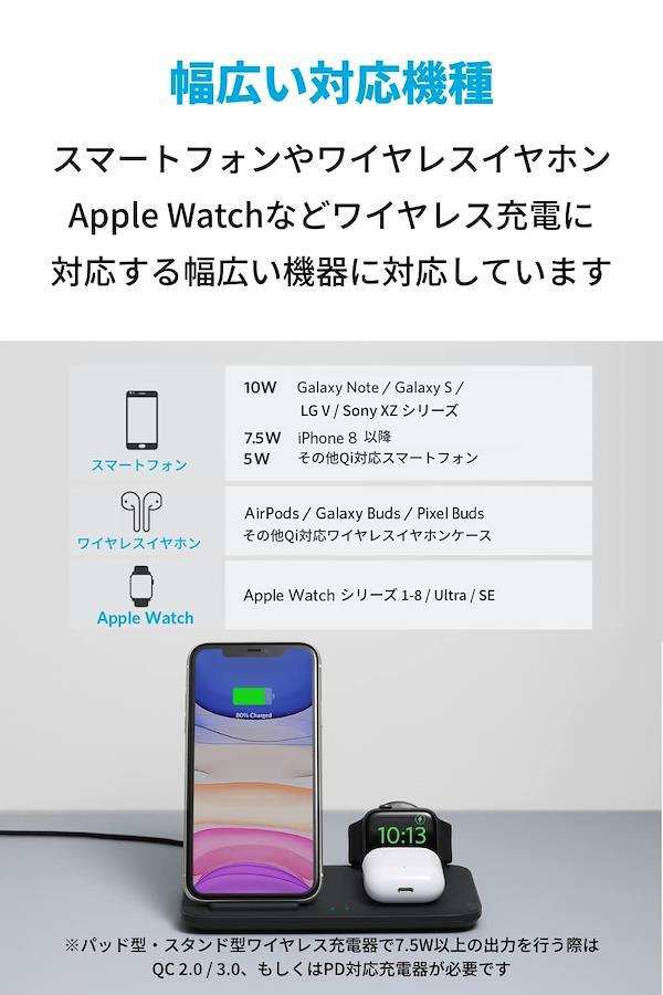 :これ1台で:パッド型ワイヤレス充電器とスタンド型ワイヤレス充電器、Apple Watchホルダーを1台にまとめました。お使いのスマートフォンやワイヤレス充電対応のイヤホン、Apple Watch、その他のQi対応機器を3台同時に充電することが可能です。(※Apple Watchホルダーをご利用の際は、純正のApple Watch磁気充電 - USB-Aケーブル(1m)(別売り)が必要です。)幅広い対応機種:Apple WatchやiPhone、Galaxyを含む各種Qi対応のスマートフォンや、Soundcore Liberty Air 2を含むワイヤレスイヤホン等、幅広い機器でワイヤレス充電が可能です。高い安全性:異物検知などの優れた保護機能を搭載し、あなたとお使いの機器を守ります。3台同時に急速充電するには、36W以上の出力が可能なPD対応USB充電器 (別売り) とUSB-C & USB-C ケーブル (別売り)が必要です(PD非対応の充電器・ケーブルでは過電圧保護機能が働き3台同時充電ができません)