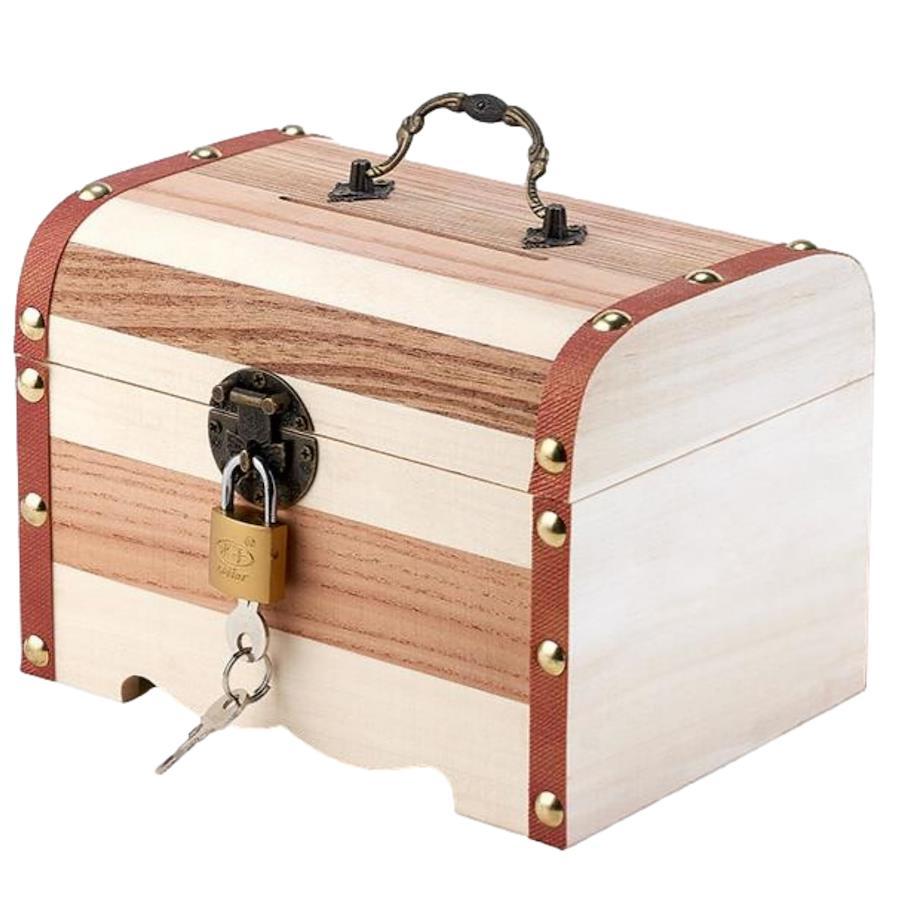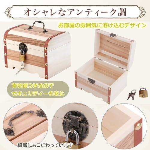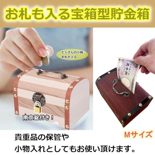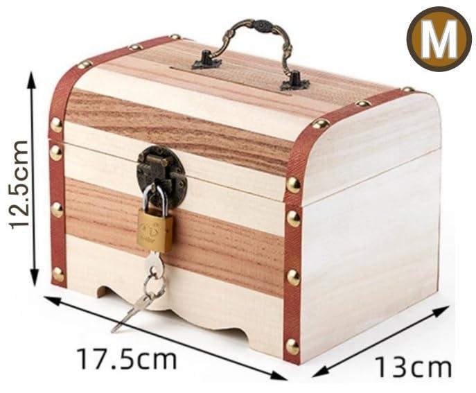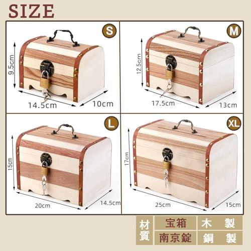 ???アンティーク好きにぴったりの木製宝箱 レトロな小物やアンティーク風のデザインが好きな方にぴったりの、木製で作られた宝箱型貯金箱です。温かみのある質感とクラシカルな雰囲気が、インテリアに特別なアクセントを加えます。毎日眺めたくなるようなおしゃれな一品です。 ????鍵付きで安心、実用性も抜群 南京錠と鍵が付属しており、貯金箱として大切な中身をしっかり守ります。小銭やお札をたっぷり収納できる深さがあり、上部の投入口はお札を折らずに入れられるサイズもご用意(Mサイズ以上)。実用性と安心感を兼ね備えたデザインです。 ??贈り物やイベント用にもおすすめ 宝箱を開けるときのワクワク感は、大人も子どもも楽しめます。お子様への誕生日プレゼントや、パーティーや謎解きゲームの小道具としても大活躍。特別なシーンを盛り上げるユニークなアイテムとして人気です。 インテリアとしても映えるデザイン ???カラーはブラウンとホワイトの2種類、サイズもS・M・L・XLから選べるので、使い方やお部屋の雰囲気に合わせてお選びいただけます。 どんな空間にも馴染む木製のデザインは、インテリアとして置くだけでおしゃれな存在感を放ちます。 ? 暮らしに彩りを添える特別なアイテム レトロな宝箱型のデザインは、収納アイテムでありながらインテリアの一部にもなる優れもの。毎日の貯金が楽しくなるだけでなく、使うたびにちょっと特別な気分になれるアイテムです。あなたの暮らしにワクワクする楽しいアクセントをどうぞ。 【本体仕様】Mサイズ:幅17.5㎝ 奥行13㎝ 高さ12.5㎝ 上部投入口8.5㎝ 宝箱Mサイズ×1 南京錠1つと鍵2つが付属します。