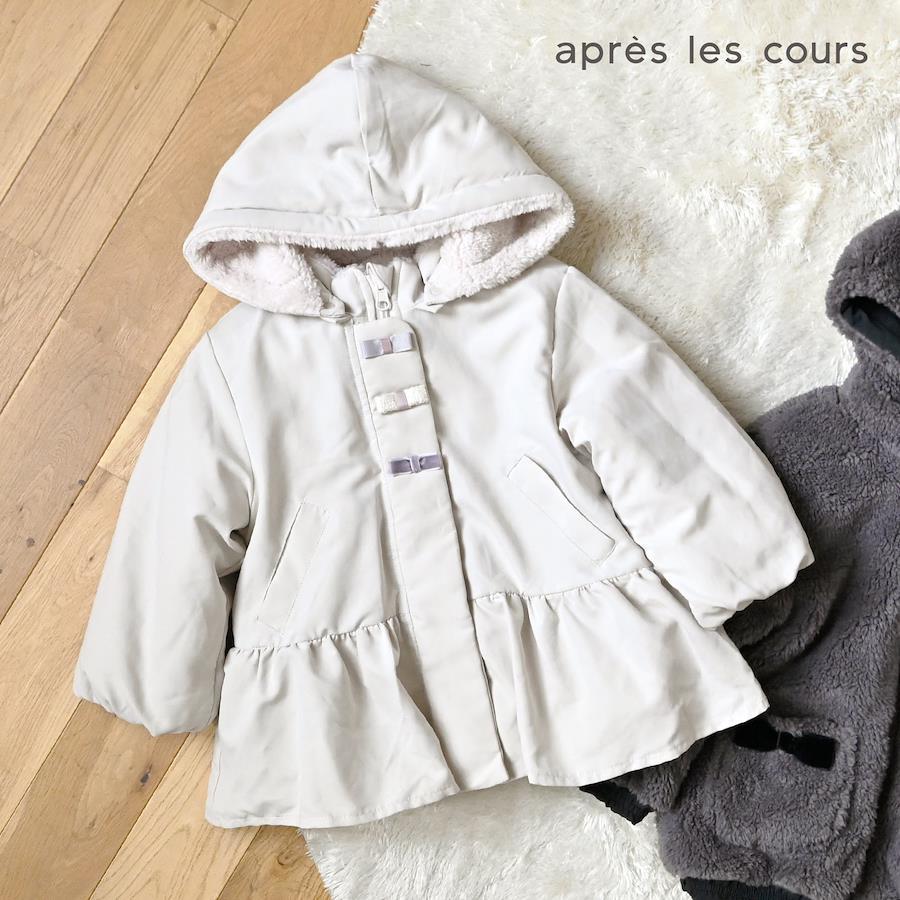 ■関連キーワード3歳 4歳 5歳 6歳 7歳 8歳 9歳 小学 1年 2年 3年 一年 二年 三年 小学校 保育園 保育所 幼稚園 学校 入園 入学 準備 入園準備 入学準備 通園 通学 子供 こども キッズ ジュニア 娘 孫 女の子 女子 女児 ガールズ レディース girl バースデー 誕生日 プレゼント プチ ミニ ギフト お祝い プレゼント おしゃれ オシャレ お洒落 かわいい 可愛い カワイイ シンプル アウター アプレレクール apres les cours ジャケット ペプラム リバーシブルアウター S501015 100 120 ブルゾン ダウン コート 冬 防寒 ボア 中綿 フリル フード 取り外し ナチュラル FO エフオー 黒 白 ピンク ブラック ホワイト ボアジャケット フリルアウター リボン ガーリー あったかい もこもこ ポケット付き ファスナー 無地 軽量 軽い フード無し 2way