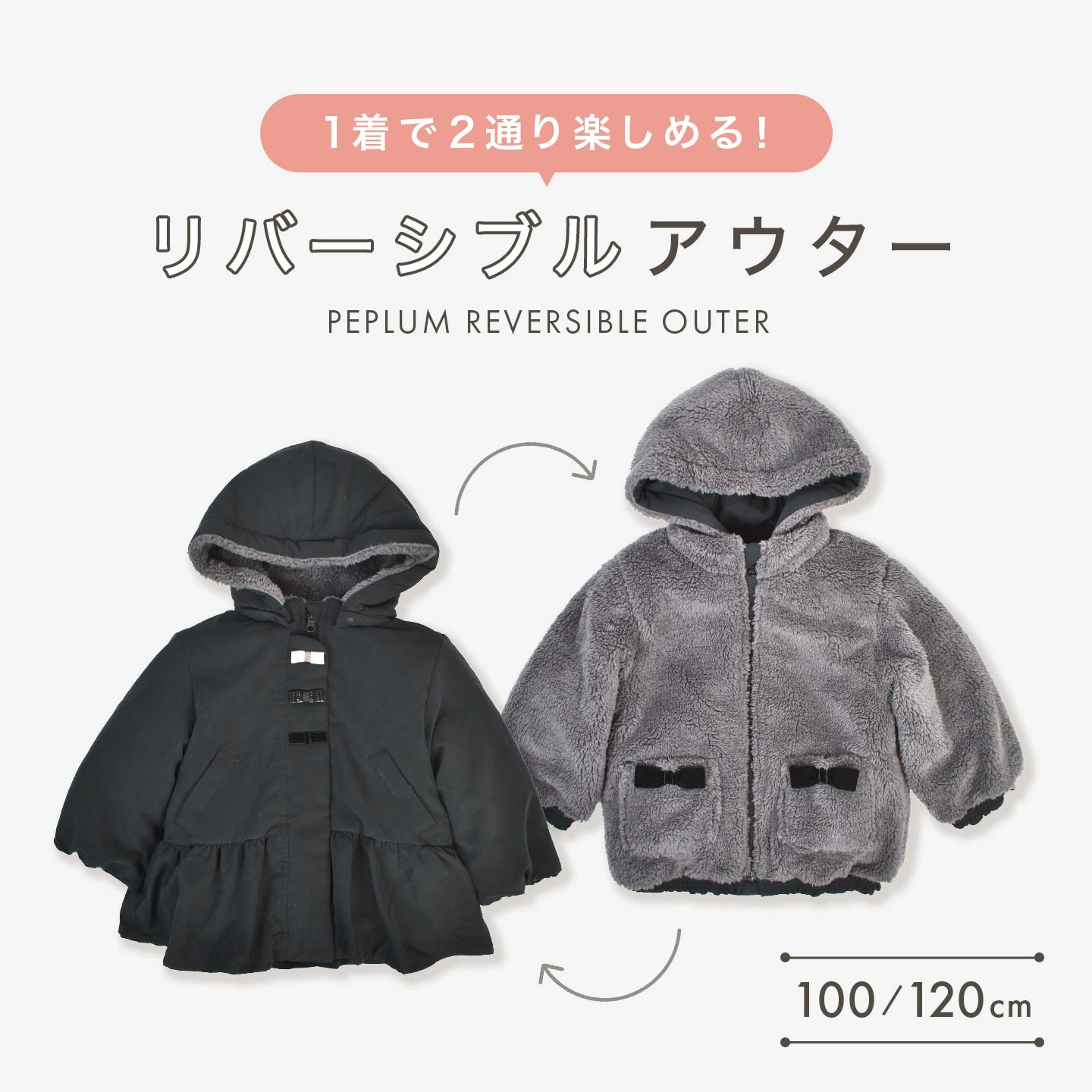 【ペプラムリバーシブルアウター】1着で2通り楽しめる♪中綿とボアのリバーシブルアウター!ふわふわのボア面は思わず触れたくなる心地よさ、中綿面はふんわり広がるペプラムシルエットで可愛らしい印象に。どちらの面にもリボンをあしらい、女の子ゴコロをくすぐるデザイン♪デザインも暖かさも叶える、この冬おすすめの一着です。