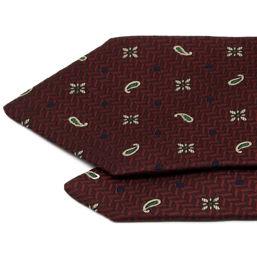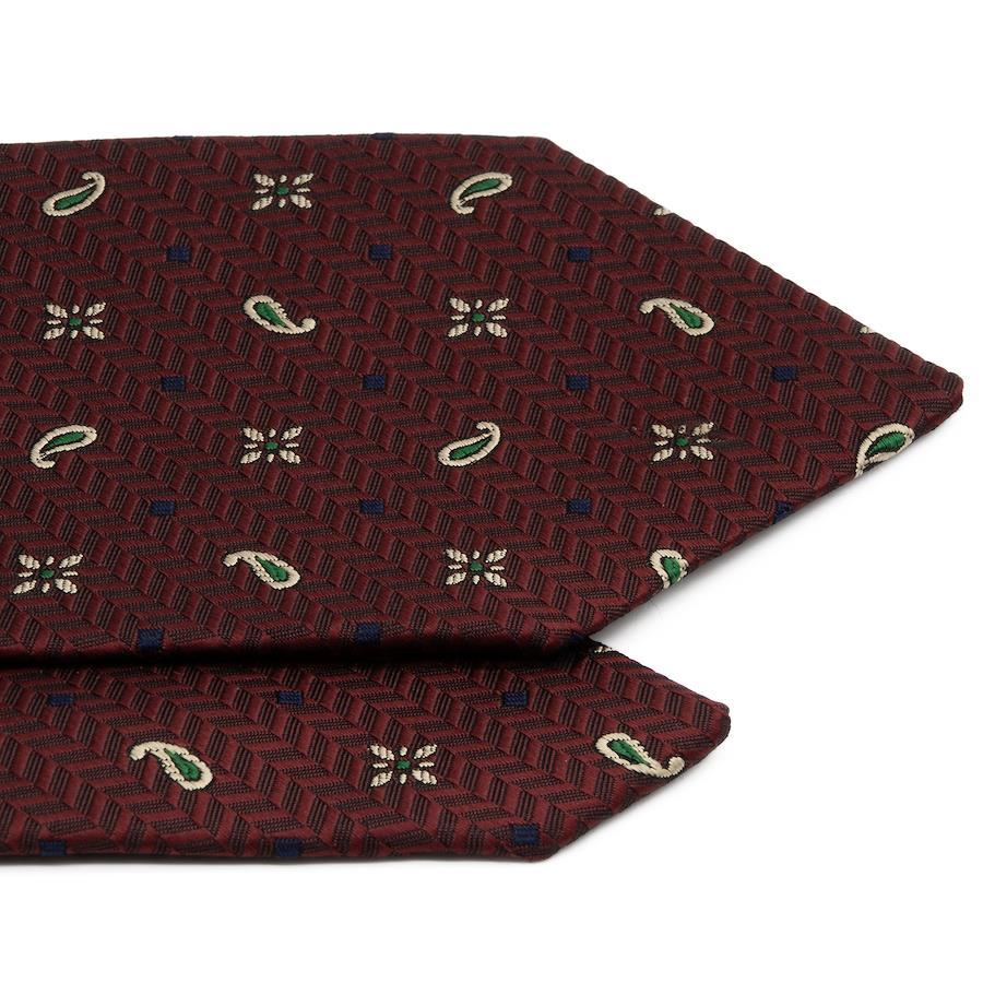 落ち着いた赤地に、繊細なペイズリーと幾何学模様が浮かび上がり、クラシカルな雰囲気を纏っております。