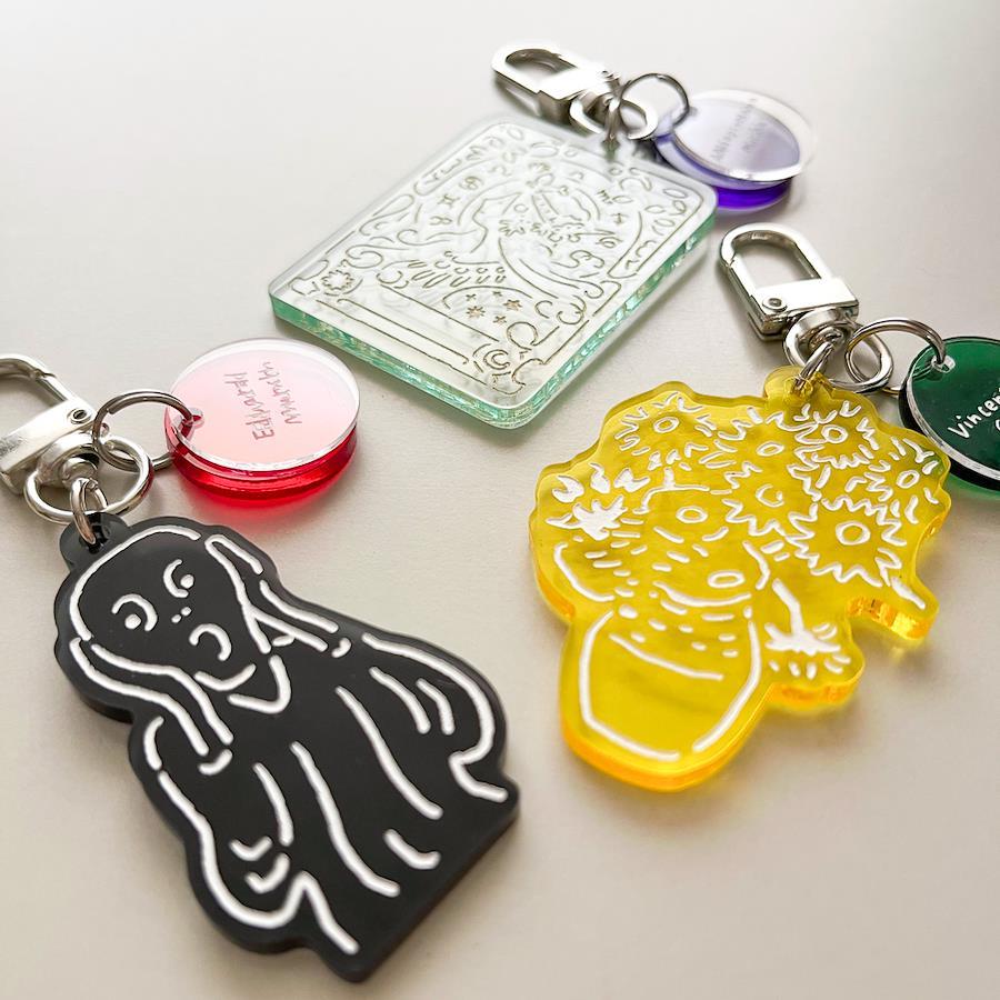 それぞれのキーホルダーには、作品ごとに異なるカラーパーツが付属し、クリアパーツにはアーティスト名が刻まれています。透明感のあるアクリル素材と、鮮やかなカラーリングが特徴で、作品の個性をさりげなく楽しめます。バッグや鍵、ポーチなどに簡単に取り付けられ、日常のアイテムをさりげなくアートで彩ることができますよ。