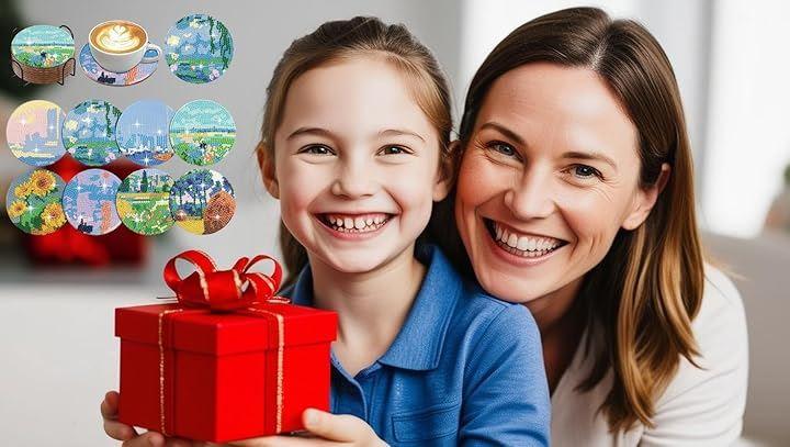「大切な人に手作りを贈ろう。 ダイヤモンドペイントコースターはギフトにも最適」 美しい輝きと温かさを兼ね備えた、手作りのダイヤモンドペイントコースター。