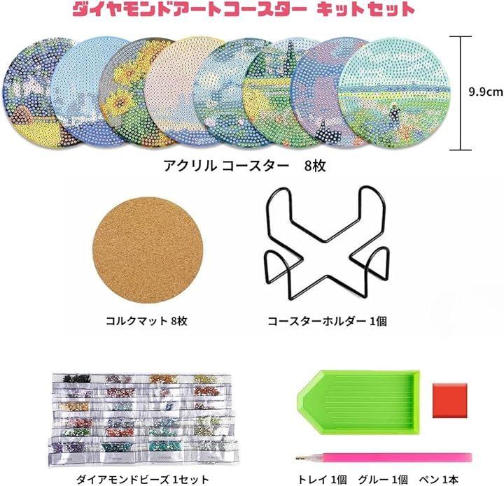 「ダイヤモンドアートコースターセットパッケージ内容」 *ダイヤモンドアートコースター:8枚 *コルクマット:8枚 *コースターホルダー:1台*カラフルなダイヤモンド:1セット*ビーズトレイ:1個、ダイヤモンドペン:1本 *グルー:1個*チャック付ビニール小袋:5枚 *日本語取扱説明書付