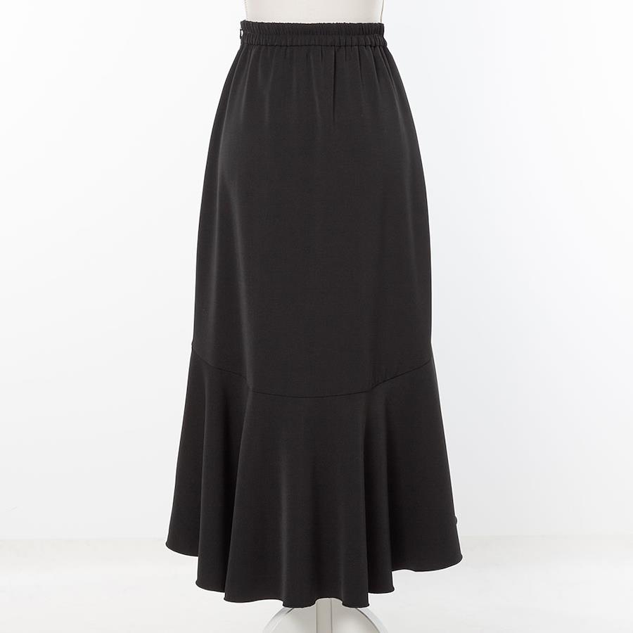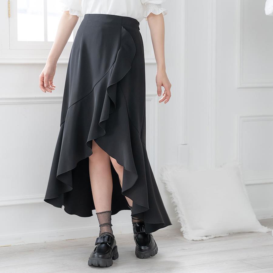 アシメフリルデザインが可愛いマーメイドスカートのご紹介。【デザイン】花びらみたいにふわりとなびくヘムが女の子らしく華やかな印象にしてくれるマーメイドスカート。前後で丈差のあるフィッシュテールの様なデザインになっており、コーデのアクセントに!程よく肌見せしながらも長めの丈感が上品で、歩くたびにひらひらと揺れるのがポイント◎左脇ファスナーを開けて着脱する仕様です。後ろウエストはゴムになっているので、履き心地も抜群です♪
