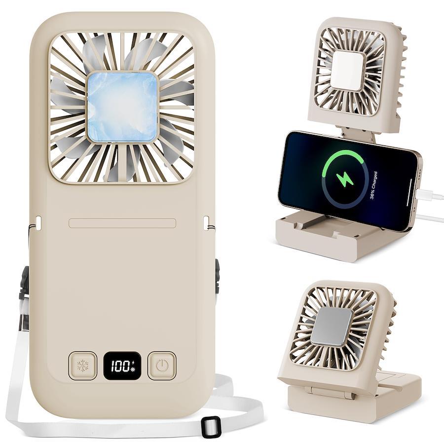 Azinol ハンディファン 冷却プレート ハンディ扇風機 (2025超強風 瞬間冷却 手持ち/首掛け/卓上/モバイルバッテリー/スマホスタンド5WAY) 小型 強力 風量3段階 リズム風搭載 5000mAh大容量 長時間連続運転 電池残量液晶表示 type-c 折りたたみ式 軽量 持ち運び便利 ストラップ付き アウトドア 熱中症対策 (ベージュ)