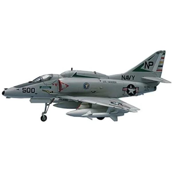 ハセガワ 1/72 アメリカ海軍 A-4E/F スカイホーク プラモデル B9 1/72スケールプラスチックモデル。1950年代初め米海軍は次期艦上攻撃機の開発計画に着手しこの計画に対してダグラス社の設計チームは、軽量戦闘機の研究から生まれた総重量6.8トン、全幅8.4m足らずの小型機を提案しました。この思い切った設計案が認められ契約が結ばれ、1954年6月22日初飛行したプロトタイプ1号機 (XA-4A)は、徹底的な重量軽減がなされ、主翼は左右一体にしてそれに胴体を乗せる機体構造の簡略化や整備性の容易さを考えて設計された機体でした。1979年2月に最終量産機の引き渡しが終了するまで、生産期間26年、総量産機数2 960機となり、いかにA-4スカイホークの基本設計が優れていたかを証明しています。A-4EはA-4Cの改良型でエンジンをJ65からJ52-P-6に換えた機体で、エンジン換装にともない空気取り入れ口の形状も変わり、主翼下面の兵装搭載量が最大8 200lb (3 720kg)に増強されました。A-4Fはアメリカ海軍向けの最後のタイプで、エンジンをJ52-P-8Aにパワーアップし、電子機器を収容するハンプ・フェアリングが胴体背面に追加されました。A-4Fはアメリカ海軍のアクロバットチーム ブルーエンジェルス にも1974年から1986年の間使用され、ダイナミックな飛行で観客を魅了しました。