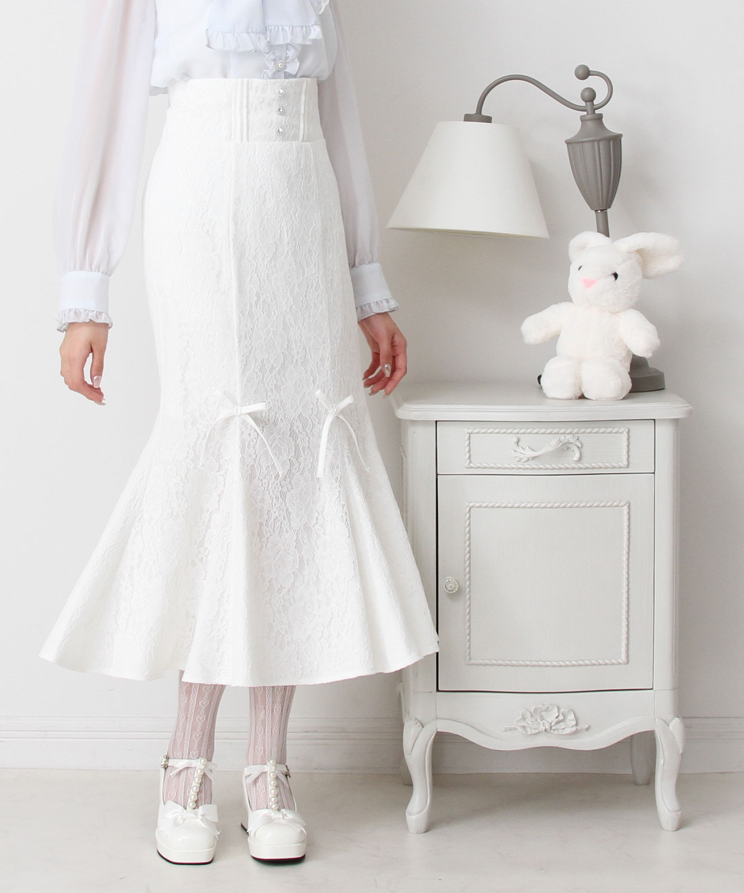 キラキラと輝く上品なハイウエストデザインマーメイドスカートが登場【デザイン】DearMyLoveから上品でかわいいマーメイドスカートが登場しました。スタイルよく見えるシルエット感にこだわりました。デザインはレース重ねデザイン、合わせやすい無地ブラック、千鳥生地の3種類×5カラーから選べます。ハイウエストデザインで中心にはキラキラと輝くパールビジューボタンがついています。後ろ部分はレースアアップデザインでウエスト部分をお好みで調整ができます。前から見えても後ろから見てもかわいく大人なデザインのマーメイドスカートに一目惚れの予感♪【素材】レース重ねの生地、無地生地、千鳥生地の3種類からお選び頂けます。本体裏地付きです。【コーディネート】上品なボウタイブラウスと相性ぴったりなマーメイドスカートです。大人っぽい雰囲気に変身し、パンプスやミュールサンダルとの相性ばっちりです。スカートはお好みのデザインをお選びください。《透け感》なし 《生地の厚さ》普通 《裏地》あり 《伸縮性》なし《生産国》中国