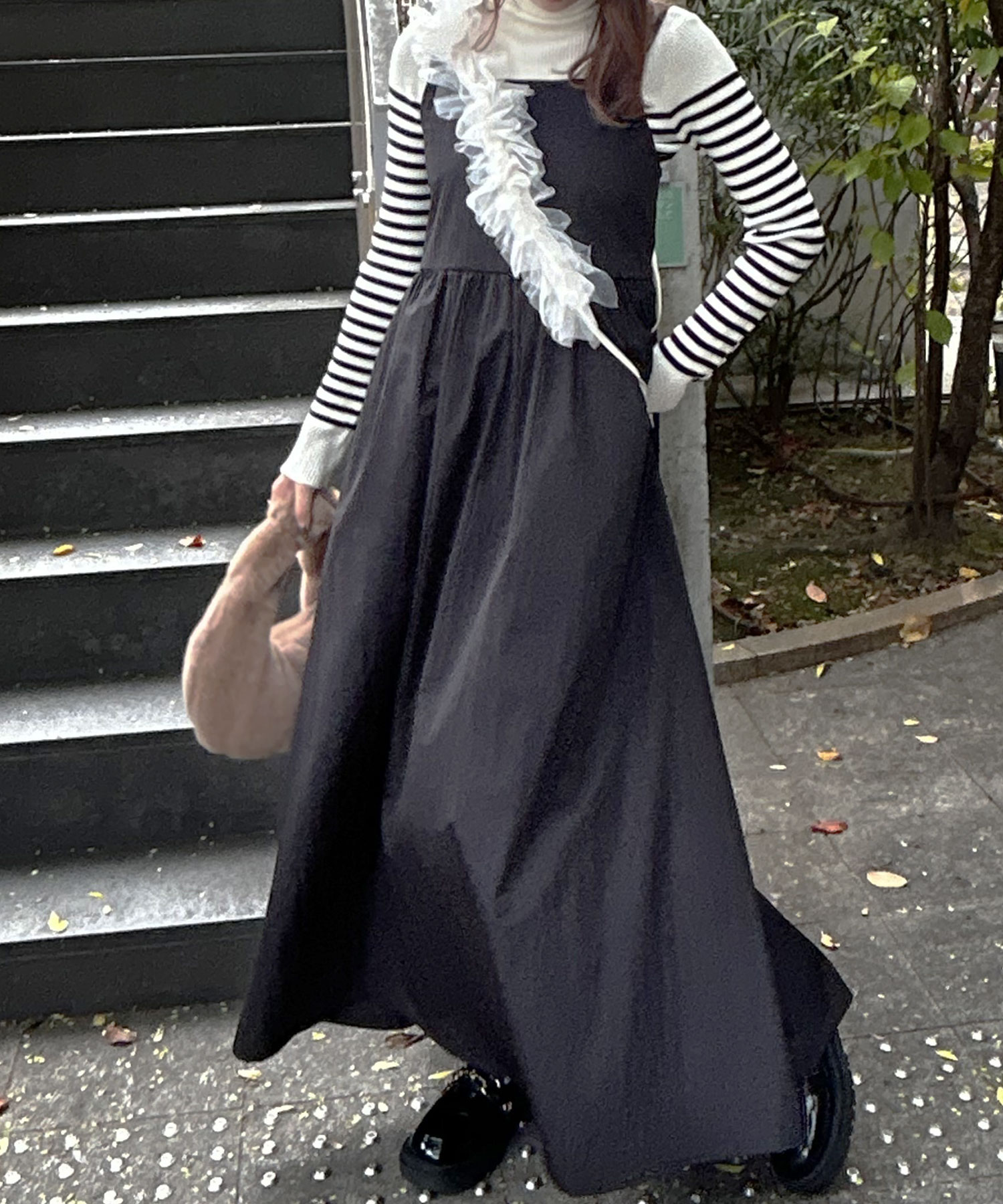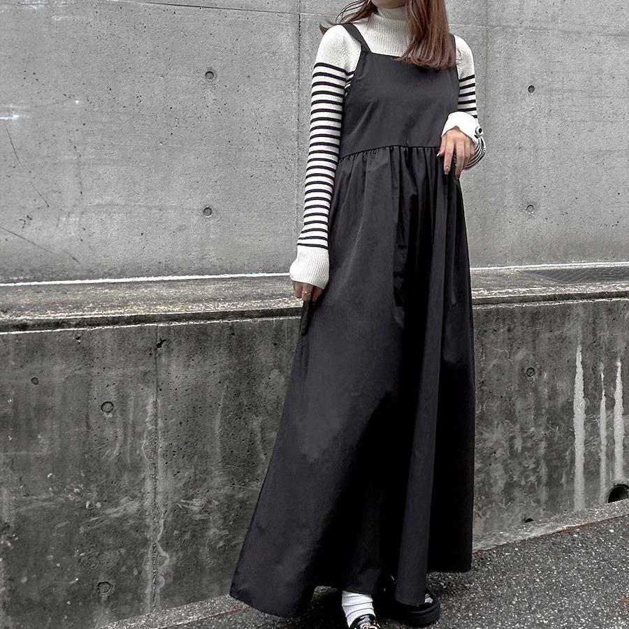 ワンピースの上からハイゲージニットを着たコーデも◎
