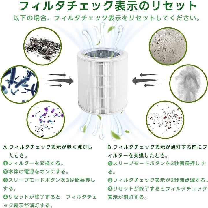 比較的汚染度の高い環境で空気清浄機を使用すると、フィルタチェック表示がオフでも、フィルターをより頻繁に交換しなければならない場合がある。