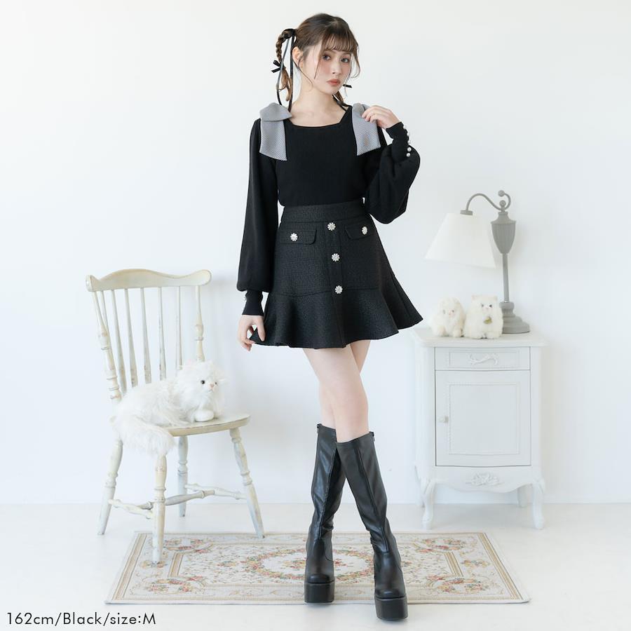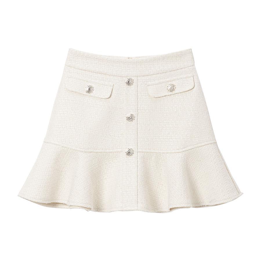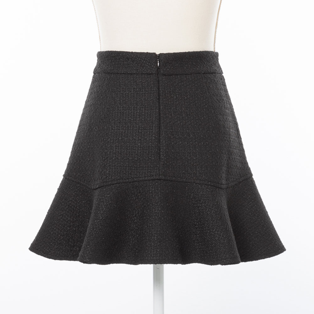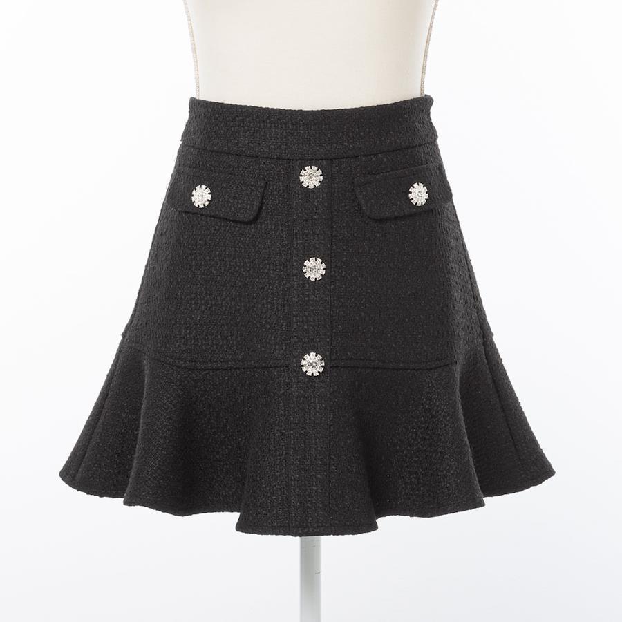 きらきらビジューが目を惹くツイードフリルスカートのご紹介。【デザイン】フェミニンガーリーに着れるツイードフリルスカートです。フロントの大きなビジューボタンがきらきらしていて、シンプルなトップスに合わせても華やかなコーデに仕上げてくれます♪後ろファスナーを開けて着脱する仕様になっています。ハイウエストデザインで、腰回りはピッタリすぎずですっきり魅せてくれる神シルエットになっており、とにかくスタイルアップ効果抜群!スカートはマーメイドフレア切替になっているので、気になる太ももは細く見えるのも嬉しいポイントです◎