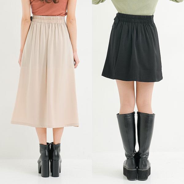 【デザイン】ダブルベルトデザインのレイヤード風スカートです。ミニスカートの上にラップ風デザインを重ねています。サイドスリットから脚をチラ見えできて、色っぽい印象に。後ろウエストがゴムなので着脱も簡単です。スタイリングしやすいワンカラーとコーデの主役になる配色デザインをご用意。