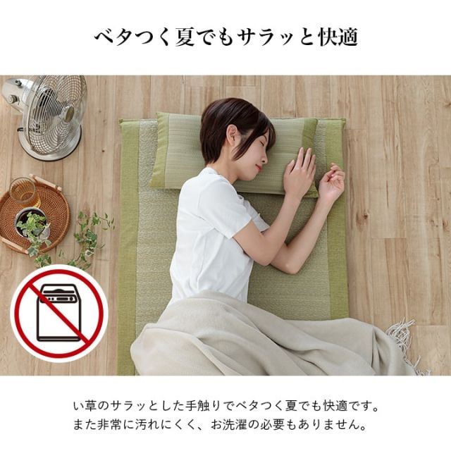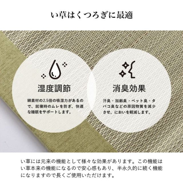"大切な方へのプレゼントに最適なシンプルない草マットです。寝っころがってテレビを見たり、折りたたんで腰かけたり、リビングでのお昼寝用に、などいろいろな使い方ができるフリーマットです。中材には固わた40mmを使用していますのでフローリングでも快適にご使用頂けます。快眠い草の効能として1.綿の約2.5倍の吸湿力2.蒸れにくい。汗による湿気を吸うことにより温度を下げ快適な就寝を促します。3.汗のにおいを軽減。汗のにおいの元となる化学物質を90%以上抑えます。などがあります。暑苦しい日本の夏でも汗のジメジメを軽減してくれます。青森県のヒバの木から抽出した「ヒバエッセンス」をメーカー独自の技術で生地表面に加工しました。ヒバエッセンスにはヒノキチオールという天然物質が含まれており、抗菌防臭効果があります。なつかしい「い草」の香りに包まれた、落ち着きの場所をどうぞ。