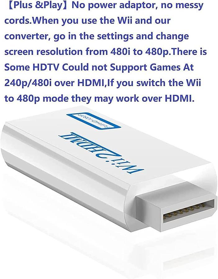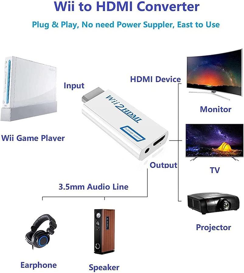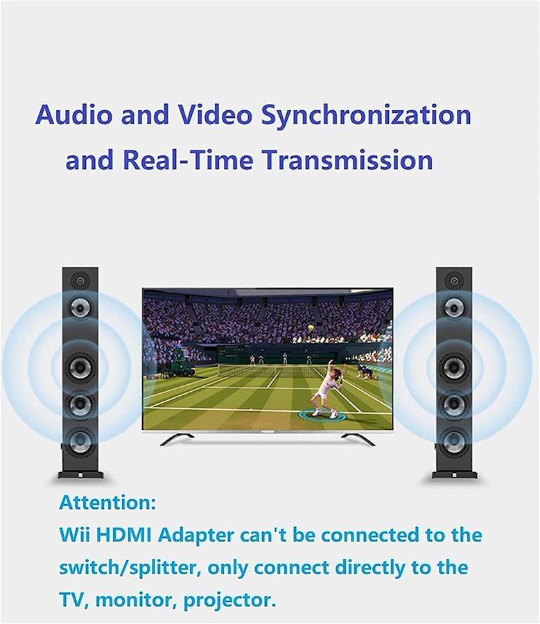 Wii to HDMI Adapter Specification High resolution makes your game screen look beautiful! Transfers your monitor beautifully! Video output HDMI: 480p, 720p, 1080p Compatibility: All Wii Display Modes (NTSC 480i 480p, PAL 576i) Interface: 3.5mm earphone jack Easily connect to HDMI large screen TV or monitor, each kind of WII game can convert WII signal to HDMI signal on display or monitor, and audio signal output at the same time. Precautions The first Wii set was to be set from "interlace" to "progressive" to "progressive." If you frequently run out of the screen, turn your wii screen settings from interlace to progressive. 【Compatibility】All Wii Display Modes (NTSC 480i 480p, PAL576i), Supports wii wiiu, HDMI Compatible, DVI Port, HDMI/DVI Cable Connection. Note: Does not support Mini Wii 【Convert Wii to 1080p Output via HDMI Connection】When you connect the Wii to this HDMI converter, you can enjoy full HD image quality and large screen, such as HDTV or projector or monitor with only HDMI input HDMI Cable Not Included: If there is no headphone or speaker on the monitor, you can use it by connecting the audio output terminal to a speaker or other device. Simply connect this adapter to the Wii body and connect the HDMI cable on your side Easy Connection: Connects directly to the display. You can enjoy the voice directly by speaker or headphone. No need for peripheral power supply Set Includes: Wii to HDMI adapter x 1, English instruction manual x 1. Free exchange within 12 months. If you have any doubts or missing parts, please feel free to contact us