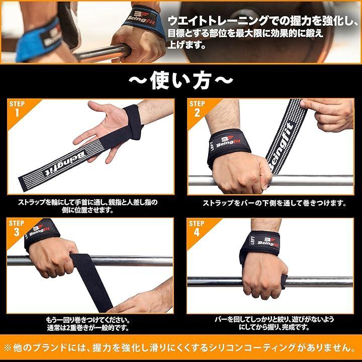 「商品の特徴」リストストラップはトレーニング時にグリップ力を上げることで、効果的にベントオーバーローイングやダンベルローイング、デッドリフト、懸垂などの筋トレ・トレーニングなどができます。