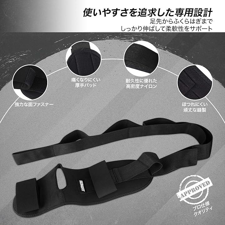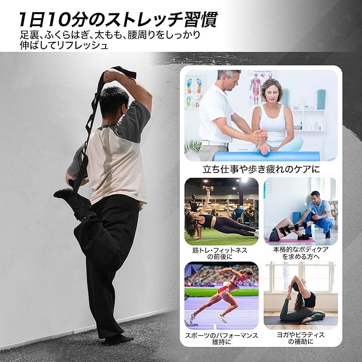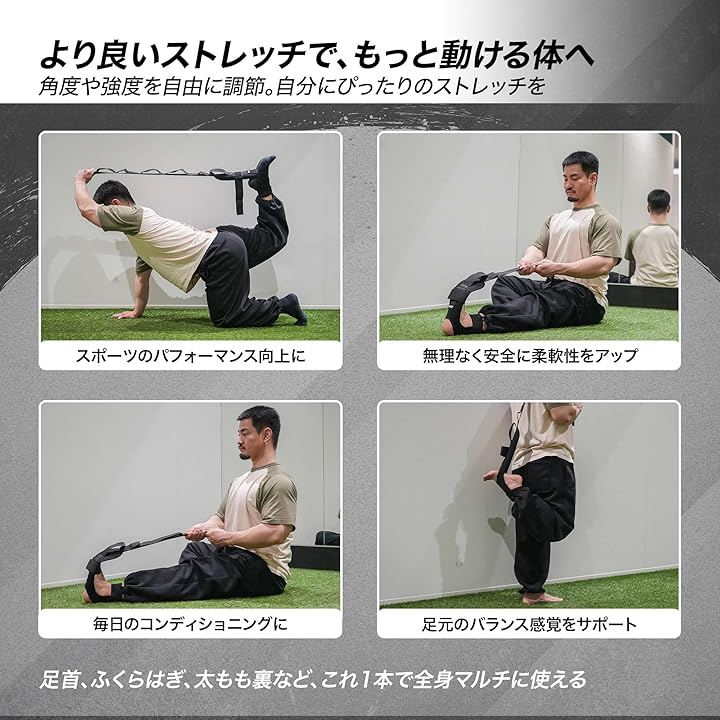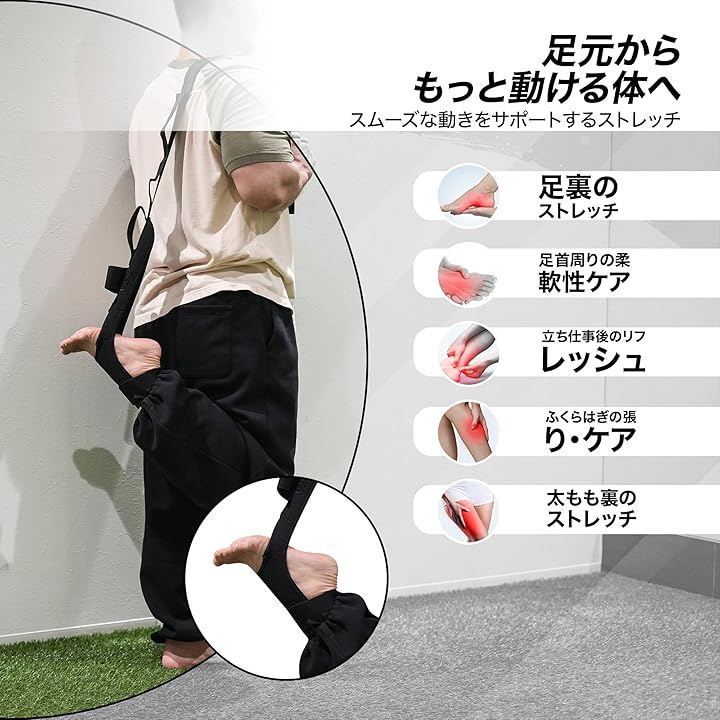 足裏からふくらはぎ、ハムストリング、クワッドまで幅広く対応し、脚全体を効率よく伸ばせるストレッチループ設計を採用しています。